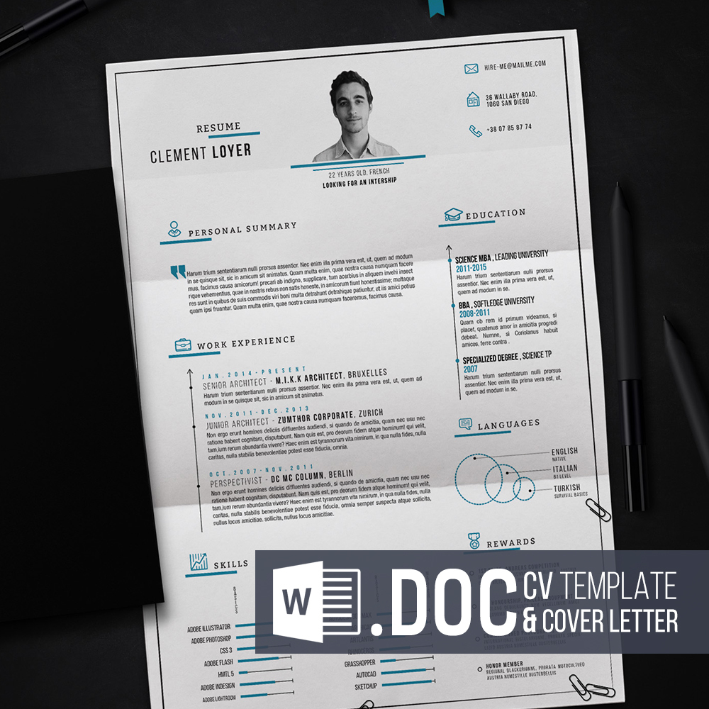 This is a template for making your own resume. You will find an editable Microsoft Word File with all the editable elements. There's also a single page letter template, to adapt the graphic of the resume.